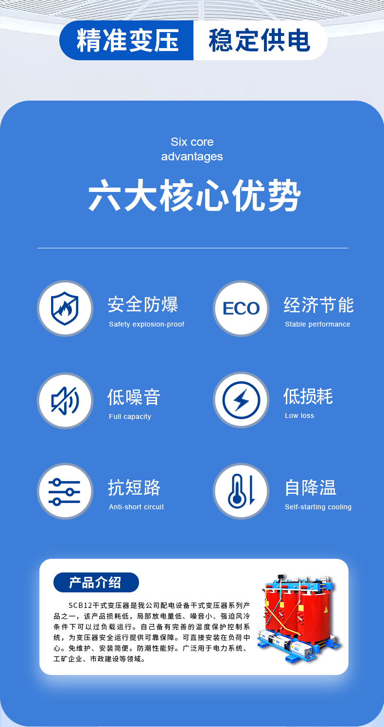 答 01全新硅鋼片噪音小,損耗低,運行穩定,壽命長02純銅線圈過載力強無氧銅線,穩定性更強,導電性能更好,抗短能力更強03浸水運行IP68防護等級,浸水運行穩定可靠04穩定可靠全密封,全絕緣的接線方式,高壓側帶熔斷保護...